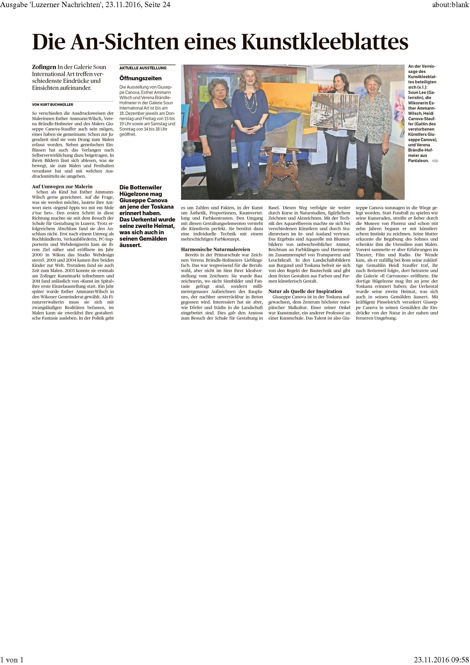 Artikel in den Luzerner Nachrichten zur Vernissage, 'Die An-Sichten eines Kunstkleeblattes', 23.11.2016